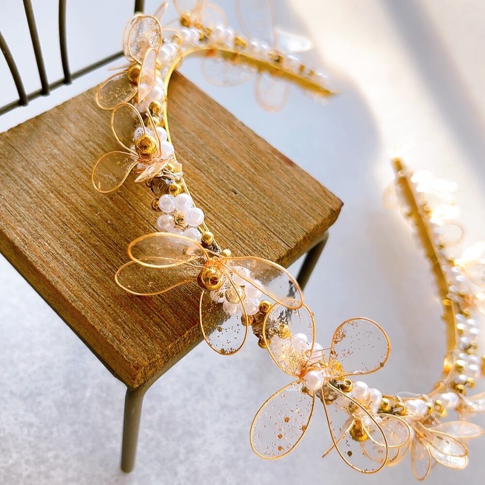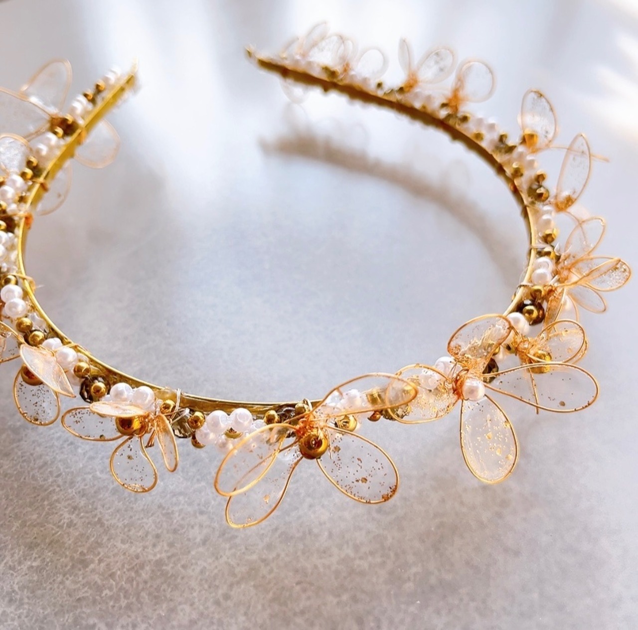 このカチューシャは、最高級のアーティスティックワイヤーを使用して丁寧に作られたディップフラワーが特徴です。繊細なワイヤーで美しく形どられた花びらはディップ液をまとい、光を受けるたびに優雅に輝きます。