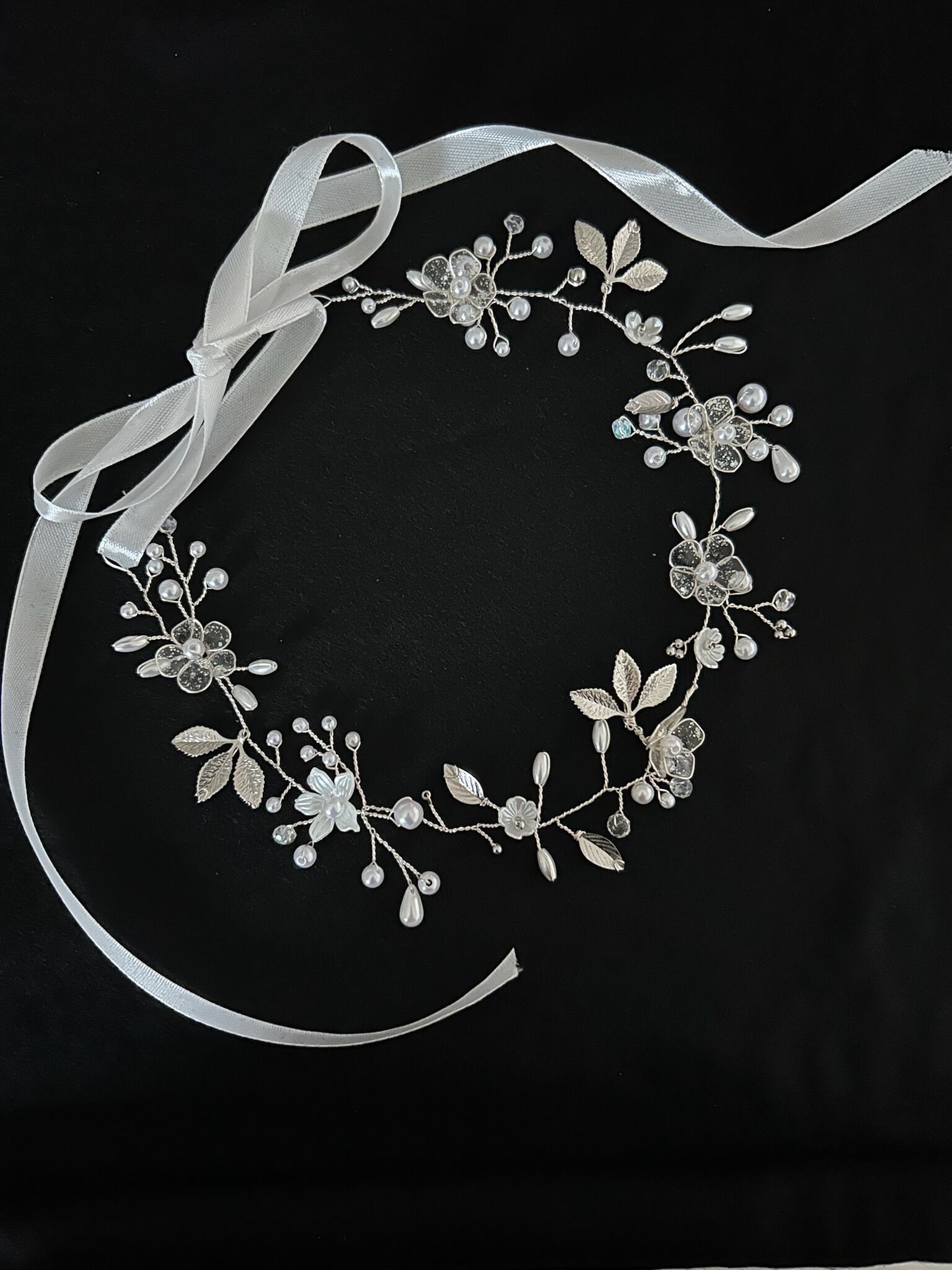 ディップアートが施されたシルバーの小枝ヘッドドレス。ウェディングやブライダル、成人式や発表会など、特別な日のヘアアレンジに最適です。髪の毛に編み込んだり、添わせたり、アレンジをお楽しみください。